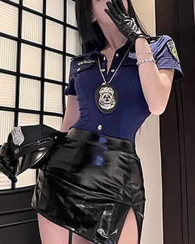 > 반팔 슬림핏 경찰 코스튬 섹시 반팔 가죽 슬릿 스커트 파티 클럽 코스프레 이벤트속옷
